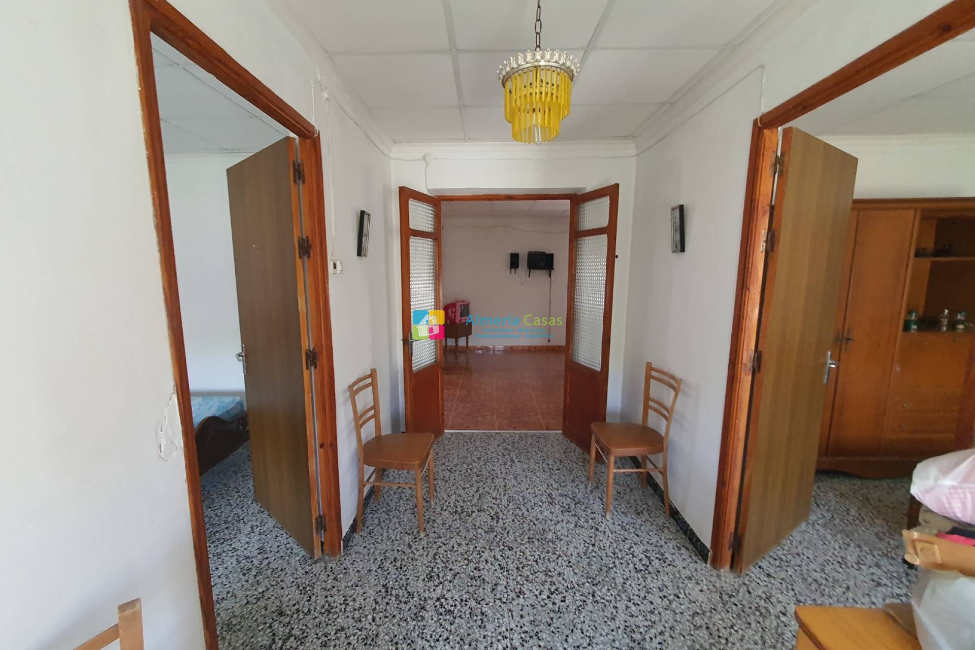 Die Eingangstür führt zu einer kleinen, modernisierungsbedürftigen, aber sehr funktionellen Küche. Von der Küche führt eine Tür in den hellen, geräumigen Wohn-/Essbereich. Von diesem Bereich gibt es 2 Türen auf der rechten Seite. Die erste Tür führt in das große, voll ausgestattete und behindertengerechte Badezimmer. Die zweite Tür führt zu einer Halle mit zwei Doppelzimmern und einem zweiten Eingang zum Anwesen. Vom Essbereich gibt es auch eine Tür, die zur hinteren Gasse führt. Eine weitere Tür führt in den ersten Stock und zu einem kleinen Hauswirtschaftsraum rechts unter der Treppe. Auf der ersten Etage befinden sich weitere 2 Schlafzimmer mit Doppelbetten und mehr Wohnraum mit Zugang zur Dachterrasse, die derzeit vollständig überdacht ist und einen schönen Schatten und eine herrliche Aussicht auf die Berge und das Tal bietet.