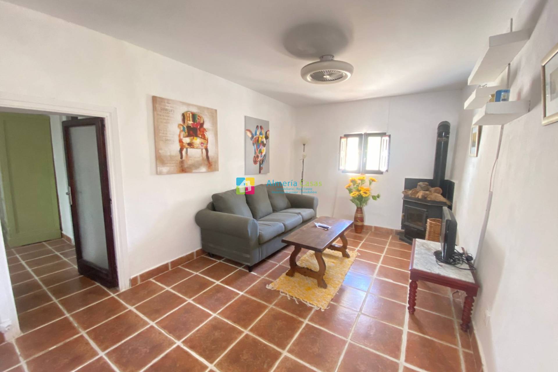 La puerta de entrada conduce a la entrada, que también es una hermosa zona de estar con sofás fijos y el hermoso baño a la izquierda. Un arco desde la entrada conduce inmediatamente al salón con estufa de leña y moderno ventilador de techo con 2 amplios dormitorios a la izquierda y el otro amplio dormitorio con aire acondicionado a la derecha. Desde la entrada, las escaleras conducen al primer piso donde encontrará la cocina grande, moderna y totalmente equipada. La cocina da acceso a una gran terraza con pérgola y amplio espacio para sentarse, con hermosas vistas a las montañas, el pueblo y sus alrededores. Un lugar maravilloso para disfrutar de la paz y la tranquilidad y donde poder comer al aire libre.