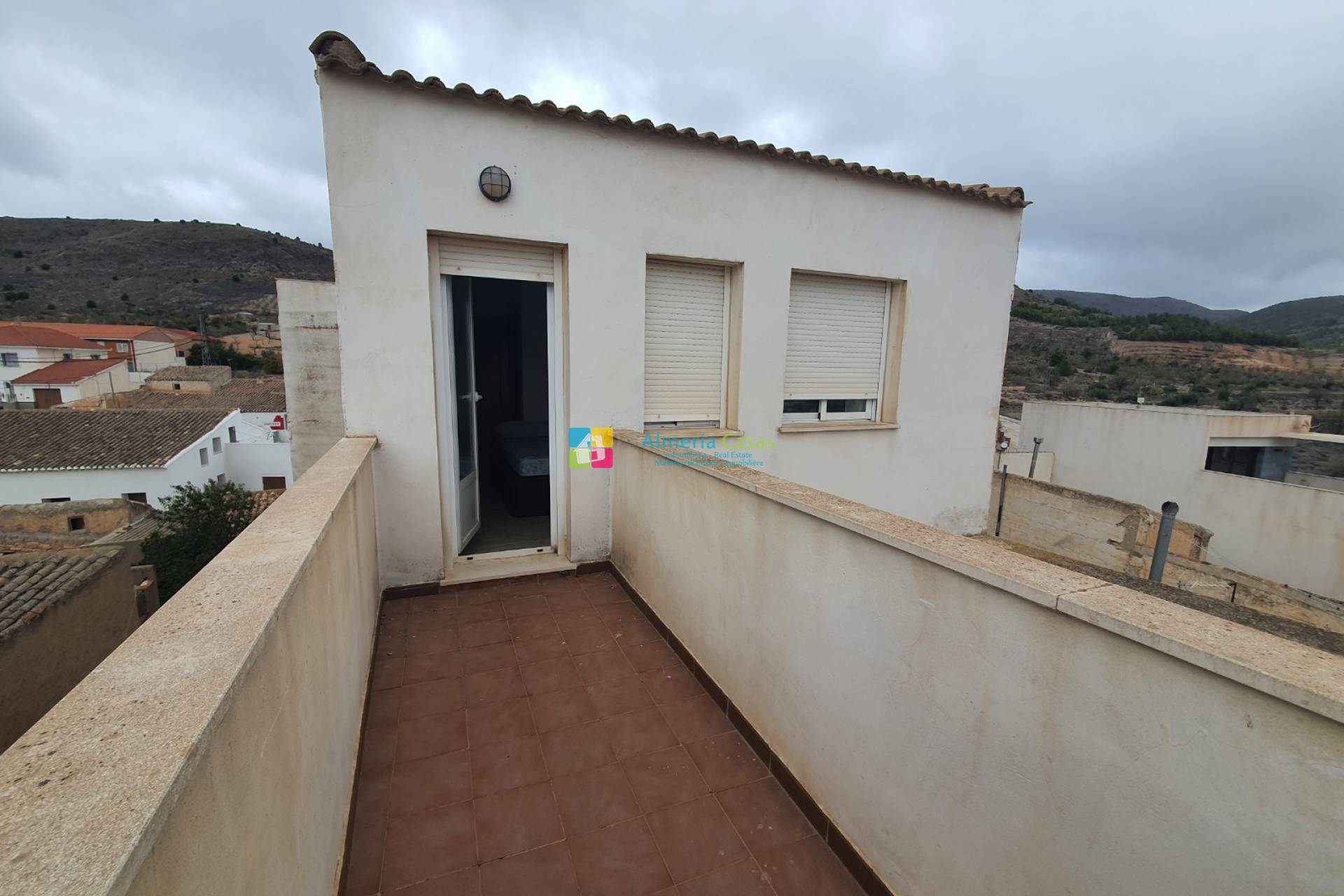 Una terraza de buen tamaño con vistas espectaculares de la ciudad, el campo y las montañas más allá. Un armario en la terraza alberga el calentador de agua eléctrico.