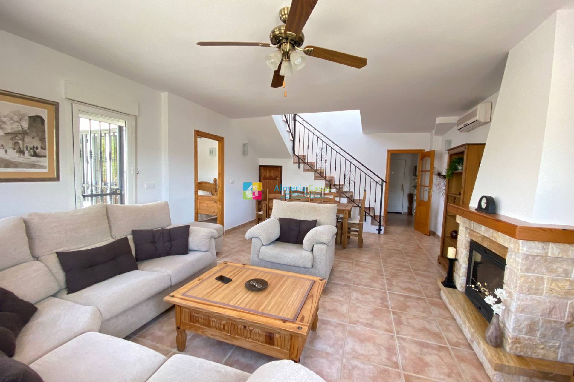 El salón/comedor es una habitación muy grande, luminosa y aireada, con chimenea y una estufa de leña con ventilador. La pared del fondo es curva con tres ventanas y puertas que dan a la terraza cubierta. La habitación se beneficia de aire acondicionado frío y caliente y ventiladores de techo. Una puerta desde el salón se abre al cuarto dormitorio, un espacioso dormitorio doble con ventilador de techo y puertas que dan a la terraza cubierta. Una hermosa escalera de mármol, con almacenamiento incorporado, conduce al rellano del primer piso, una puerta que accede a la azotea y al recamara principal. El dormitorio principal es de muy buen tamaño y hace eco de la pared curva y las ventanas del salón de abajo, las puertas que dan al patio conducen a la terraza de la azotea con increíbles vistas sobre el campo abierto y las colinas más allá. Este dormitorio se beneficia de aire acondicionado frío y caliente, ventilador de techo, armarios empotrados y un cuarto de baño privado con una gran cabina de ducha acristalada, lavabo e inodoro.
