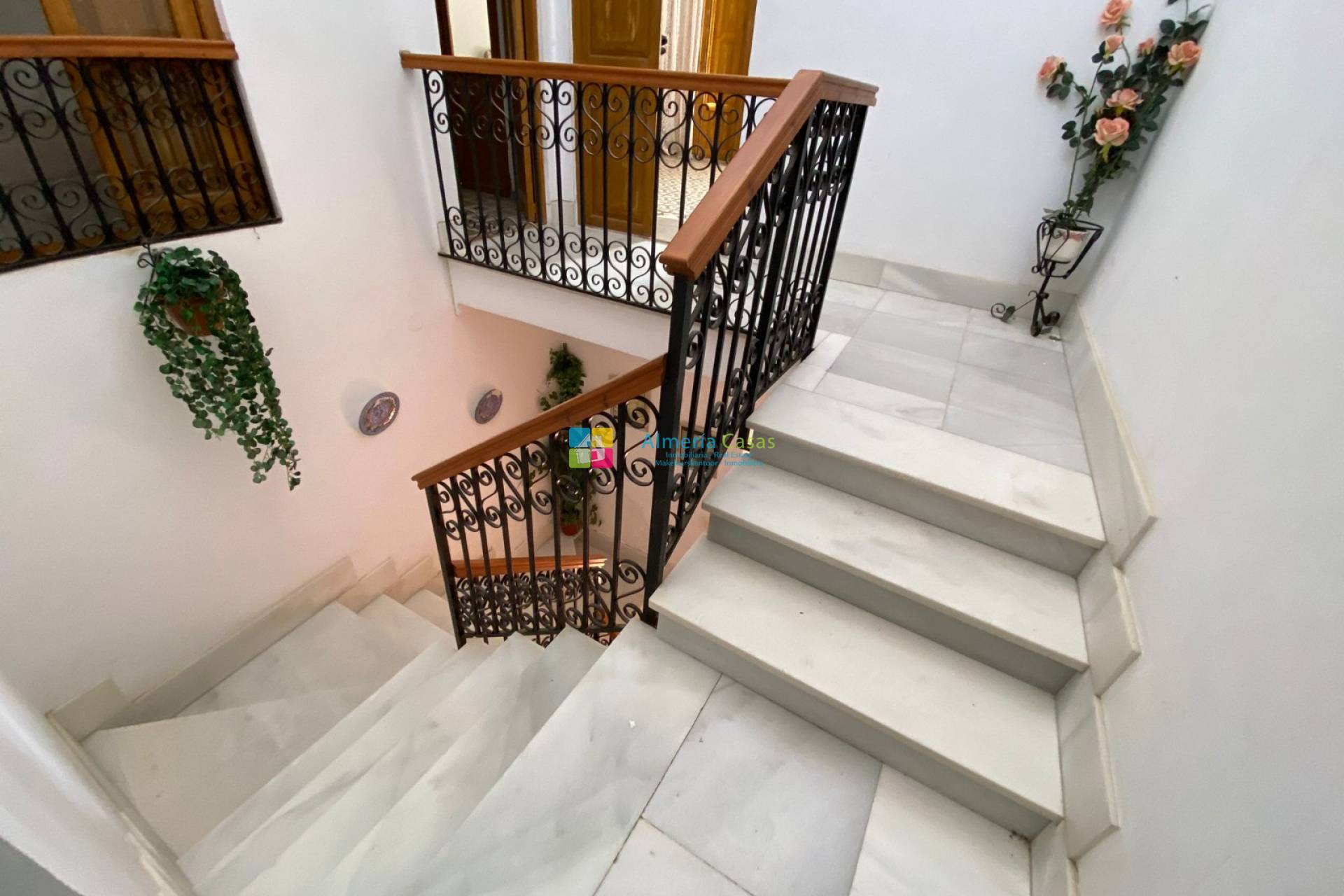 Las puertas dobles de madera conducen a un pequeño salón desde donde una puerta de entrada alta conduce al espacioso salón. A la derecha hay una sala de estar con un dormitorio al lado desde el cual puertas altas conducen al comedor con chimenea. Desde el gran recibidor también se accede directamente al comedor. Desde el comedor se accede a un gran patio cubierto con chimenea. Desde el patio hay acceso a la cocina y baño con ducha a la derecha. A estos también se puede llegar desde el comedor. El patio conduce a un amplio jardín con un trastero con chimenea y un baño con ducha. Detrás en el pasillo hay un sótano debajo de las escaleras. La escalera de mármol conduce al primer piso desde donde a la derecha hay un amplio dormitorio doble con terraza en la azotea y en la parte delantera de la casa hay dos dormitorios más, uno con balcón.