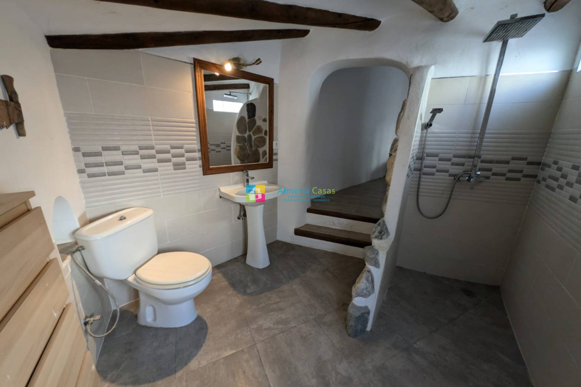La puerta de entrada conduce a la entrada y al frente se encuentra el comedor y luego el salón con estufa de leña. A la izquierda del salón hay un moderno baño con ducha y al lado la cocina equipada, muy espaciosa y con mucho carácter, con una puerta que da a un gran patio con leñera. De vuelta al comedor se accede a un dormitorio doble. Desde el comedor una escalera conduce al primer piso donde hay un gran rellano. A la izquierda hay un amplio dormitorio con puertas de balcón. De vuelta en el rellano hay una habitación a la derecha con un baño al lado y a la izquierda un hermoso y característico baño con ducha. Además, un amplio dormitorio doble con ventanales balcón. Desde el primer piso una escalera conduce a una gran terraza con magníficas vistas de los alrededores.