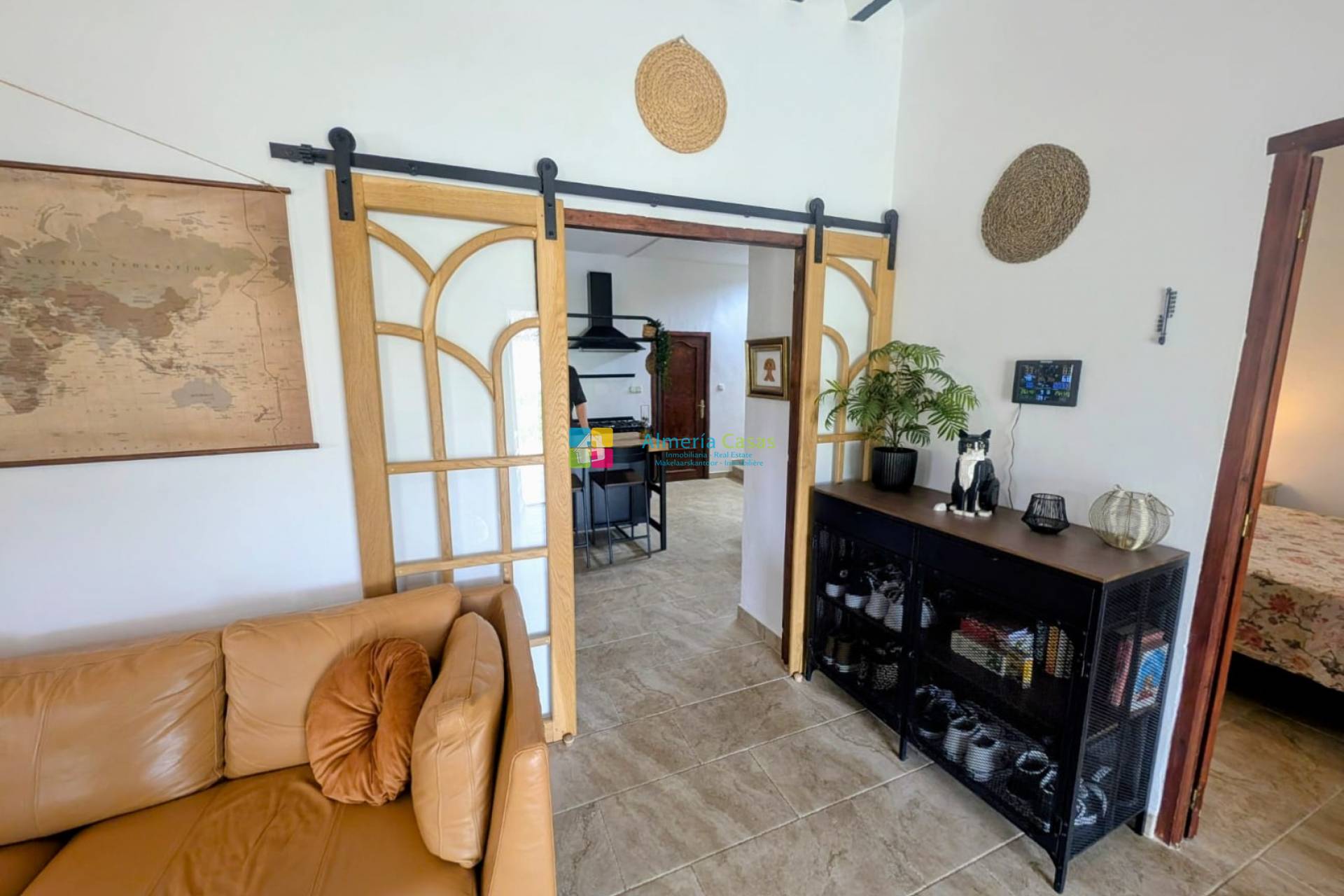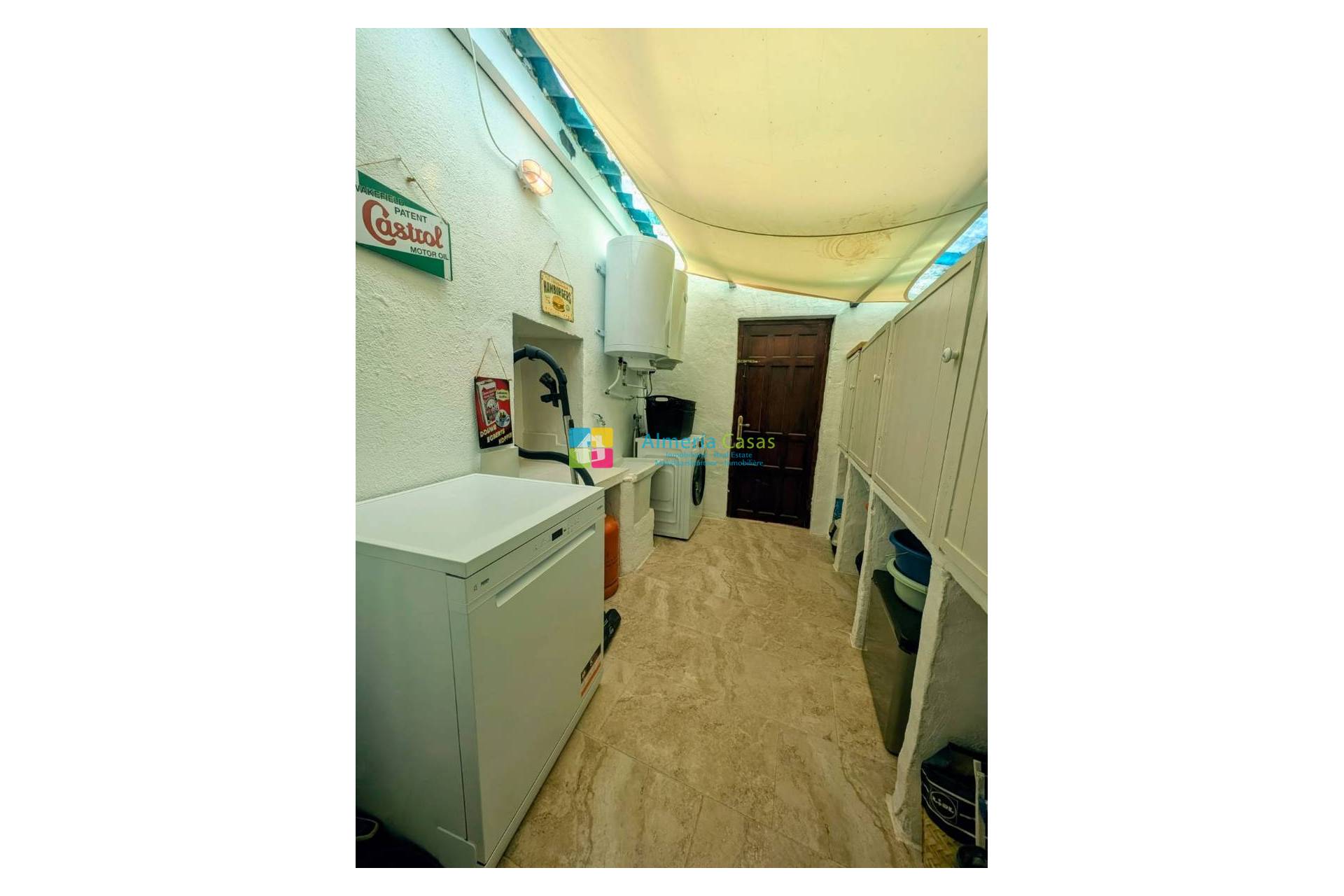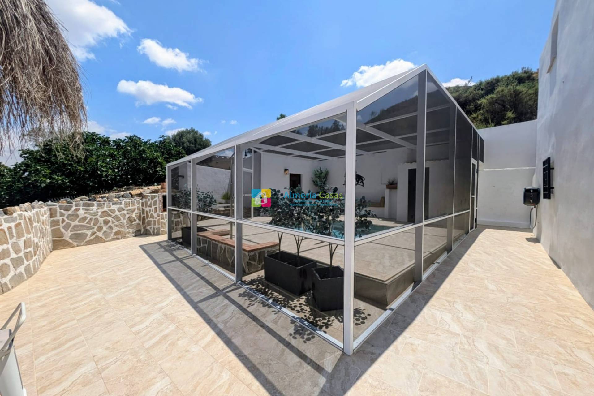 Una doble puerta para vehículos y una puerta peatonal conducen a la zona de aparcamiento pavimentado con amplio espacio para varios vehículos. A la derecha hay una cochera y un trastero. En la parte delantera de la casa hay una fantástica terraza cubierta que se extiende a lo largo de la casa, con vistas al jardín y unas impresionantes vistas de las sierras y del pueblo de Almanzora. Un lugar perfecto para cenar y relajarse a la sombra. La entrada principal a la casa se realiza desde la terraza cubierta.