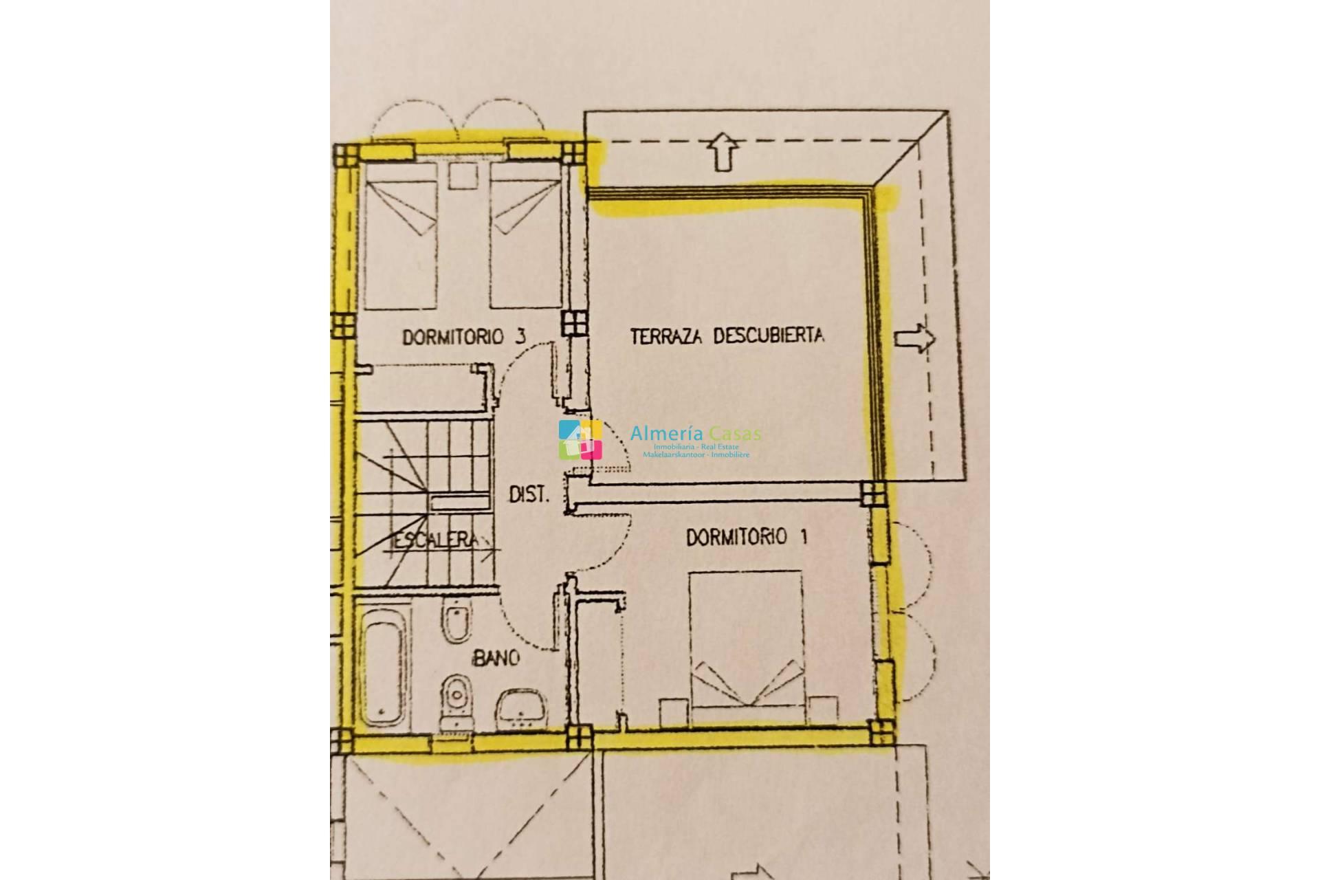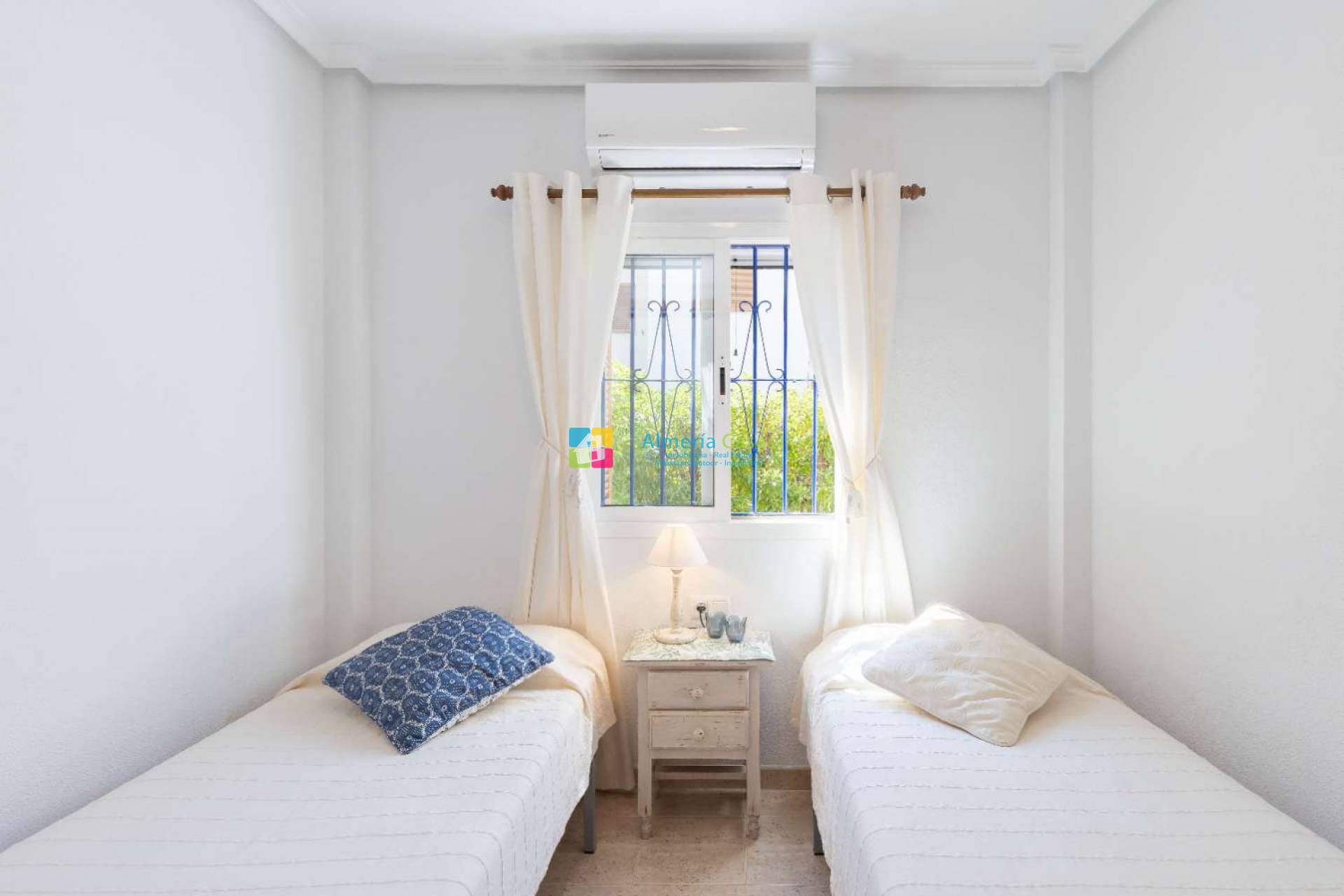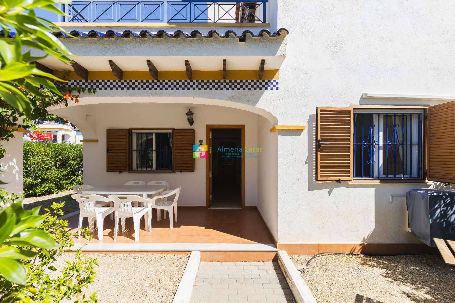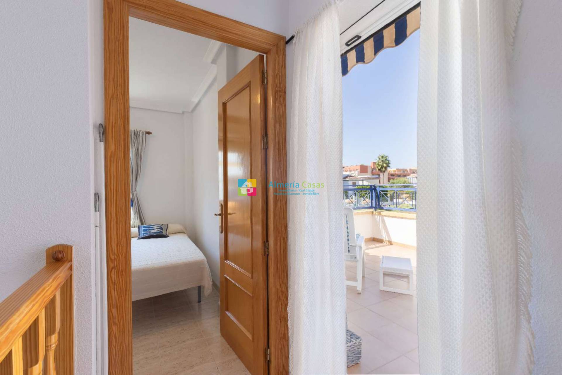 En planta alta encontraremos 2 dormitorios dobles con armario empotrados, baño completo y terraza amplia con vistas al interior de la urbanización, piscina y sol de tarde.