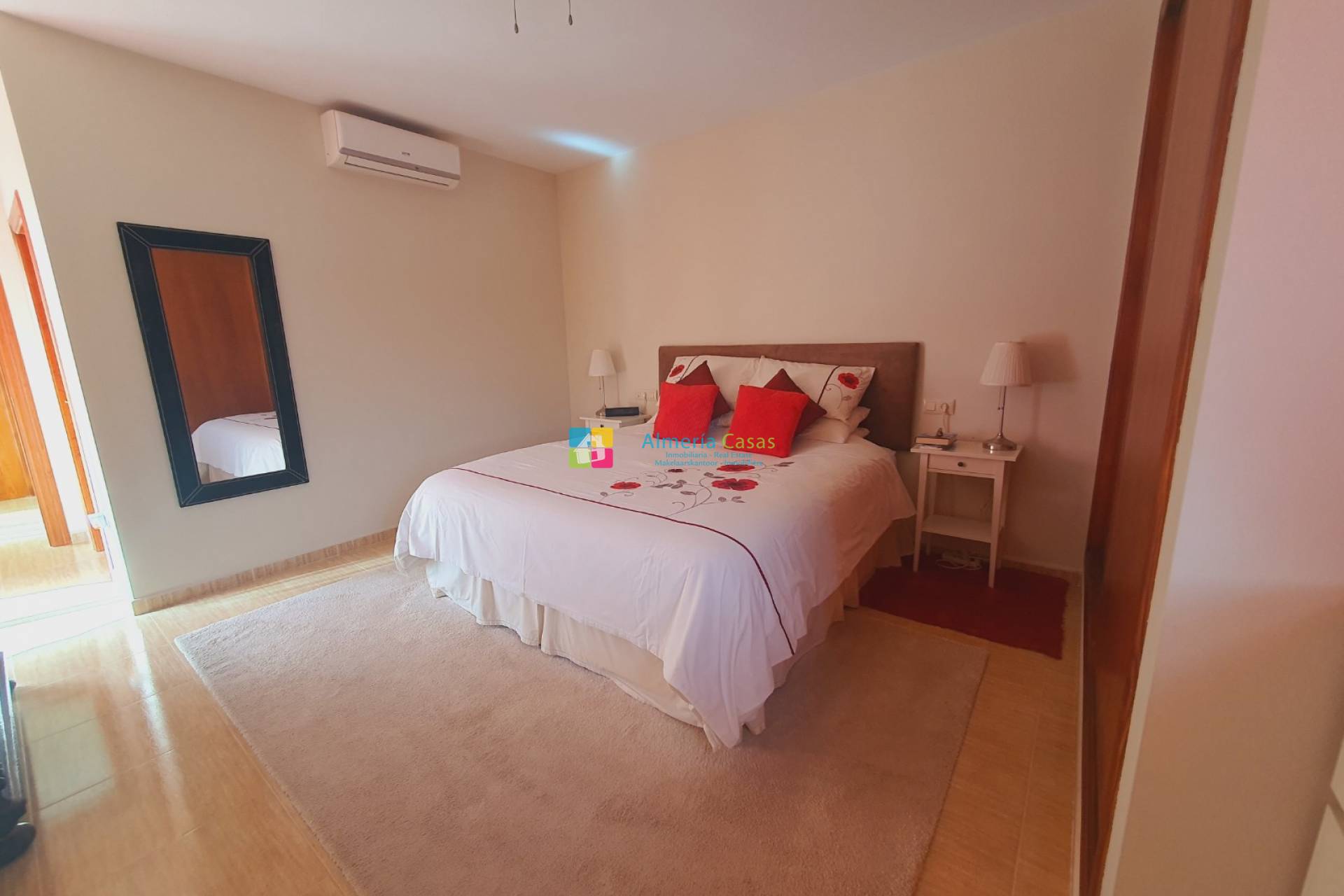 Las escaleras conducen a un rellano con acceso a la terraza de la azotea y a los dos dormitorios adicionales. A mano izquierda se encuentra la espaciosa suite principal con armarios empotrados, ventilador de techo, unidad de aire acondicionado y baño en suite. Las puertas conducen desde este dormitorio a la terraza con vistas espectaculares a las montañas. El segundo dormitorio es un dormitorio doble amplio y luminoso con ventilador de techo, aire acondicionado y puertas que dan a la terraza.
