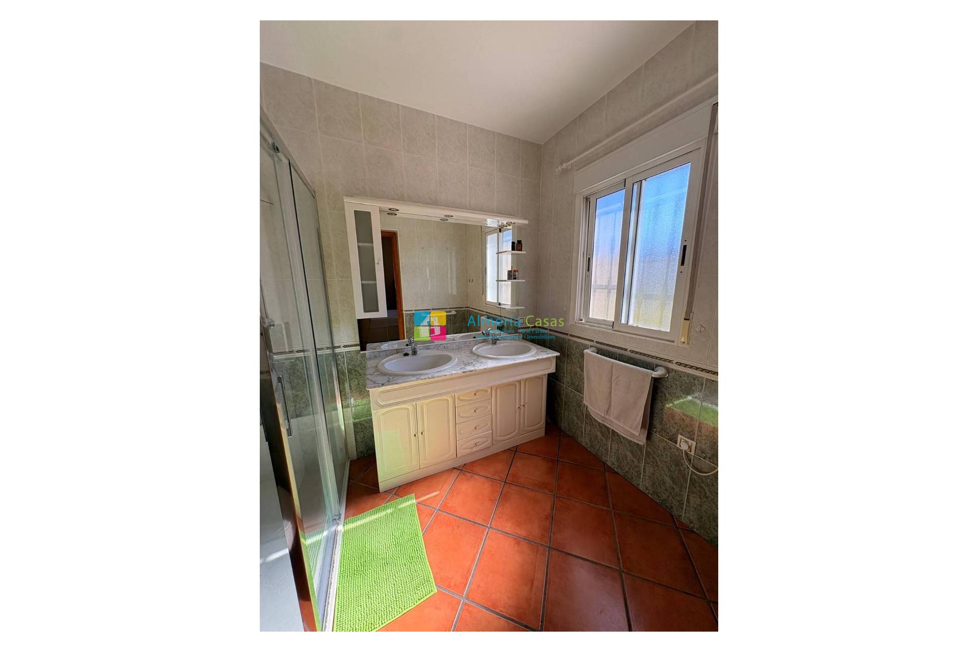 A la derecha del salón se encuentra el segundo dormitorio de invitados, también un amplio doble con armarios empotrados. A continuación está el dormitorio principal, muy espacioso, con armarios empotrados y baño en suite con ducha. Todas las habitaciones cuentan con aire acondicionado y mosquiteras en las ventanas.