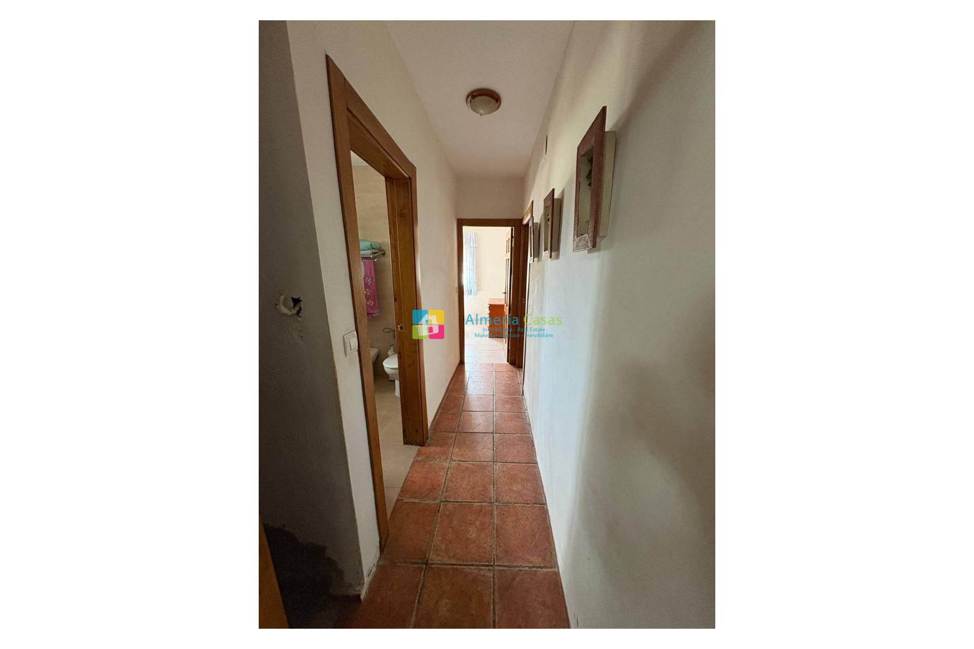 De retour à l'intérieur, il y a un couloir à gauche avec la salle de douche et les 2 autres chambres.