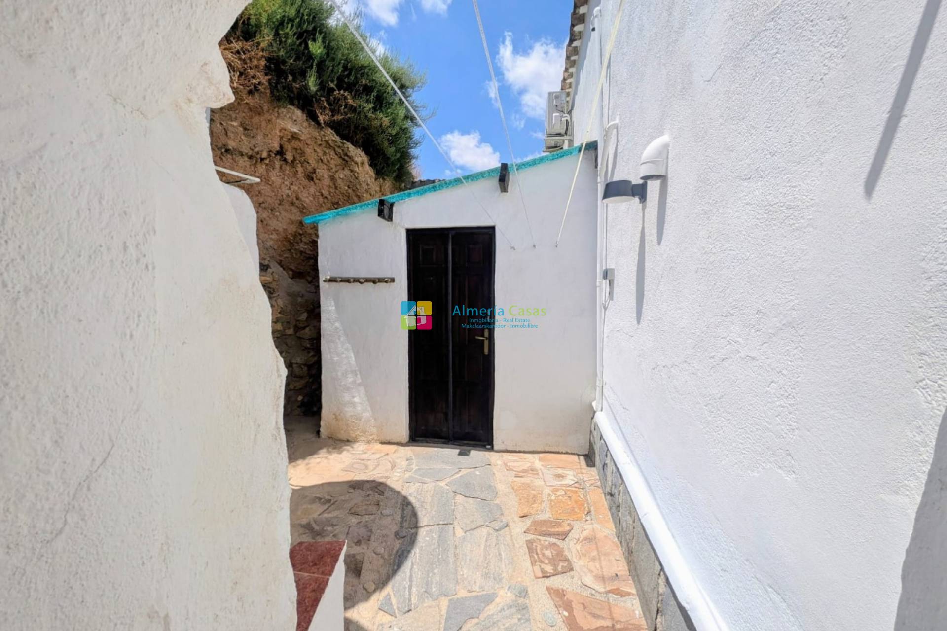 Un double portail et un portail piétonnier mènent au parking pavé pouvant accueillir plusieurs véhicules. À droite se trouvent un abri voiture et un abri de rangement. À l'avant de la maison, une magnifique terrasse couverte s'étend sur toute la longueur, surplombant le jardin et offrant une vue imprenable sur les montagnes et la ville d'Almanzora. Un endroit idéal pour dîner et se détendre à l'ombre. L'entrée principale de la maison se fait par la terrasse couverte.