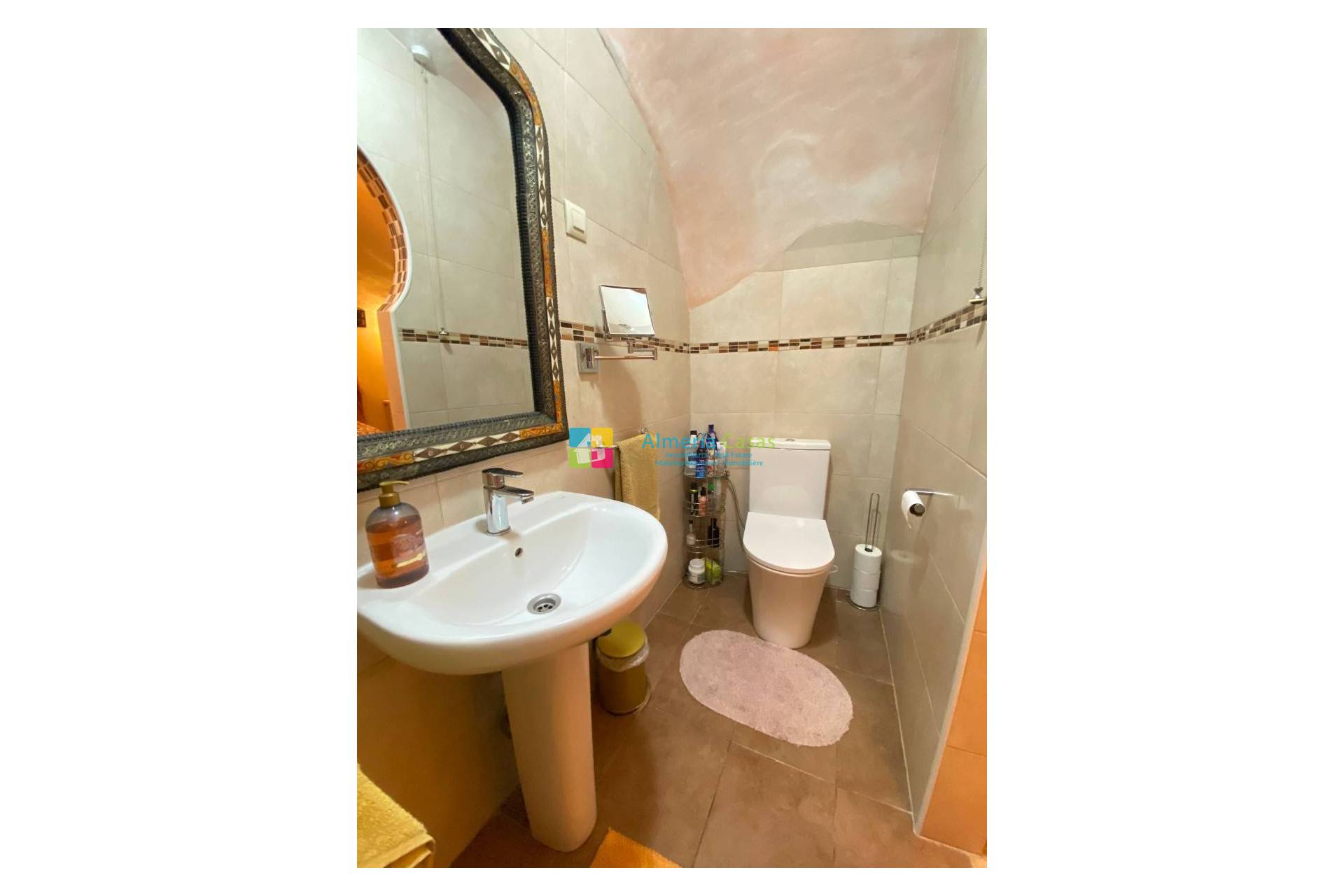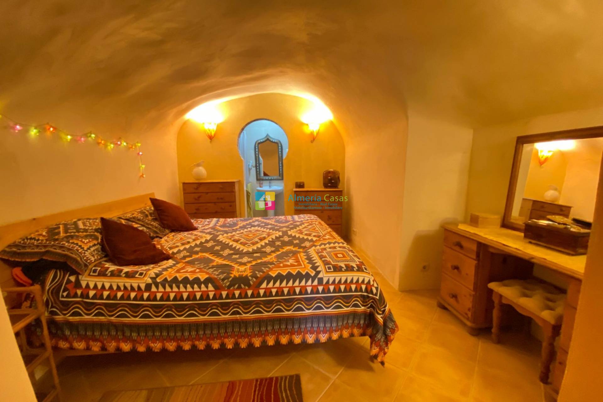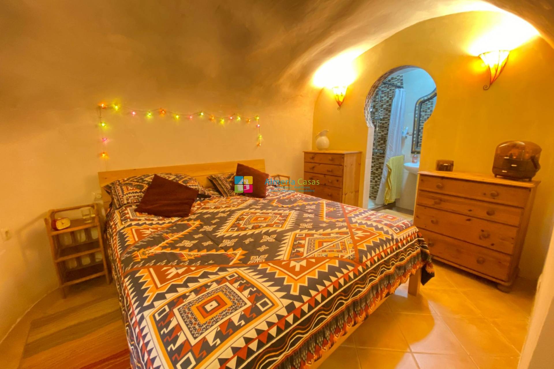 En entrant dans la maison par une porte en bois, vous serez accueilli dans un salon principal chaleureux et accueillant, avec une magnifique cheminée en granit équipée d’un poêle à bois. La décoration d’inspiration marocaine et les détails architecturaux charmants sont présents dans toute la maison, lui conférant un caractère véritablement unique.