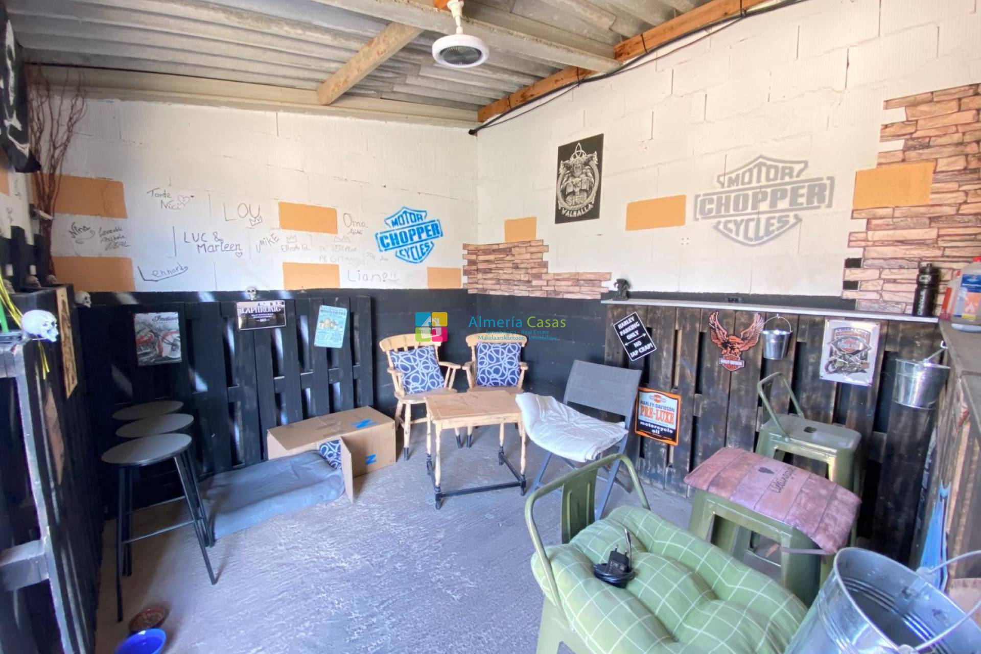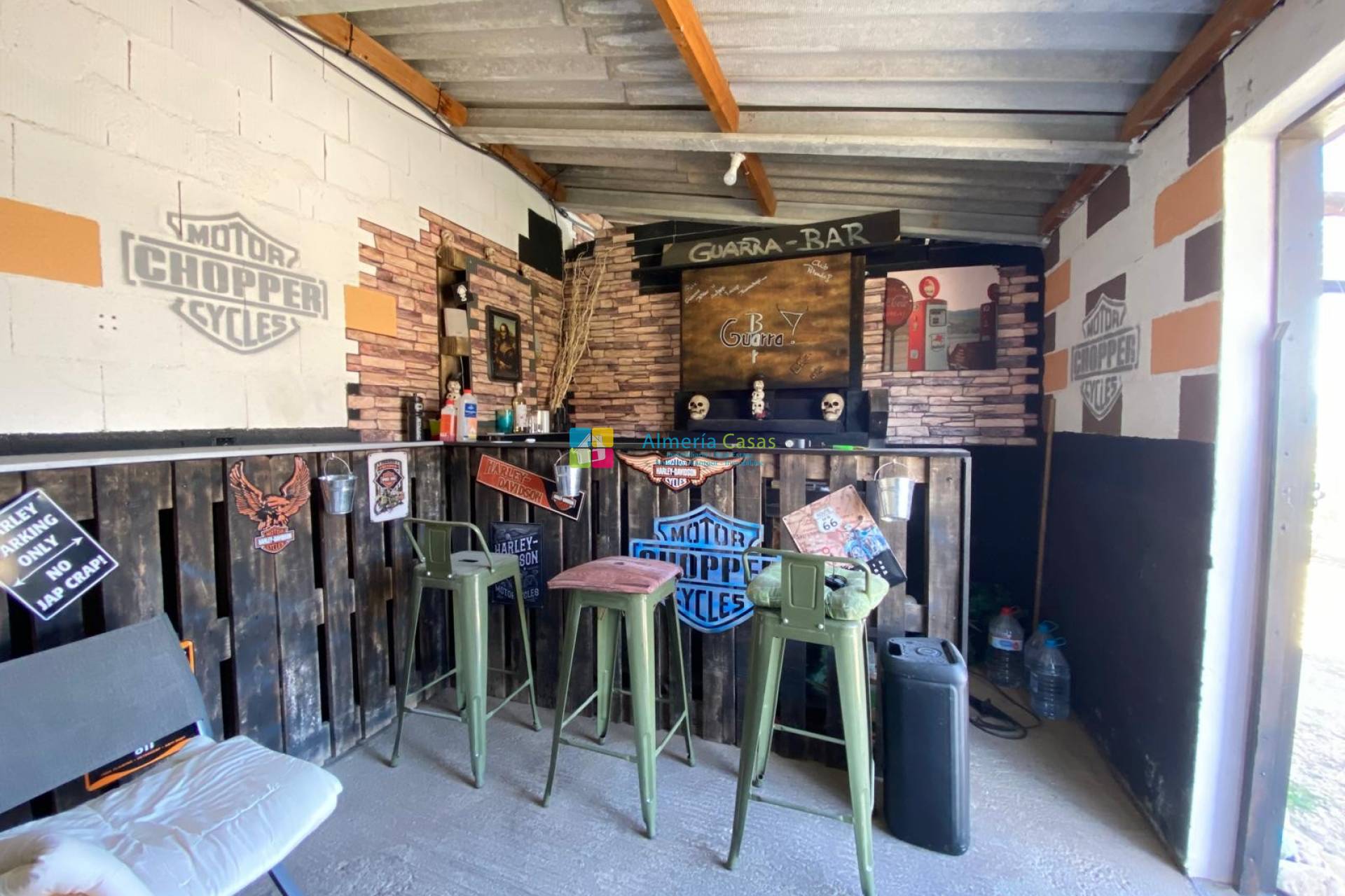 De l’autre côté de l’allée se trouvent le garage et les anciennes écuries. Celles-ci peuvent être reconverties si souhaité, mais elles servent actuellement de poulailler élégant, de diverses pièces de rangement, d’une chambre supplémentaire et d’un espace bar/salon unique. Une pergola en bois à l’avant de ce bâtiment offre une ombre supplémentaire.