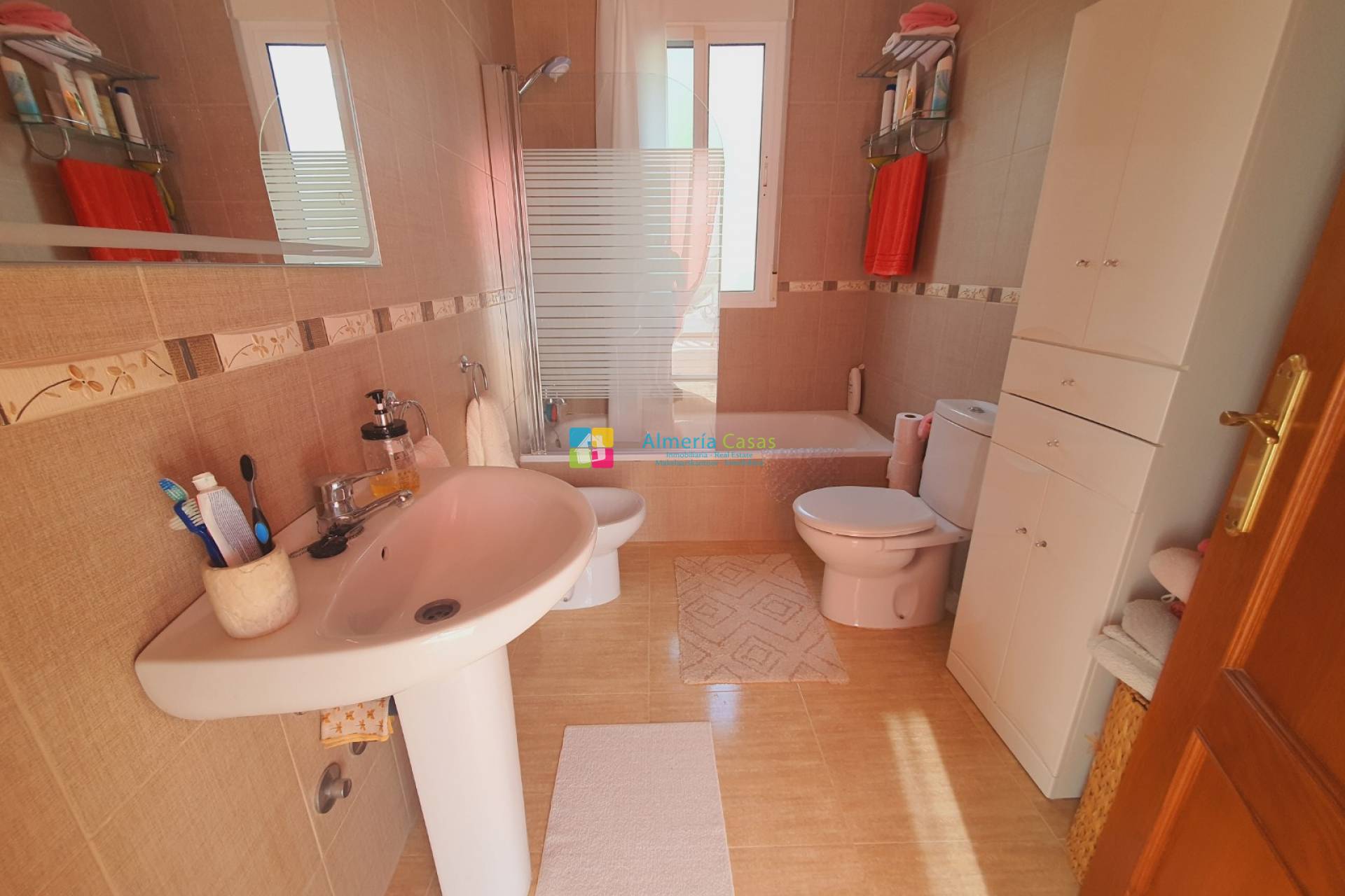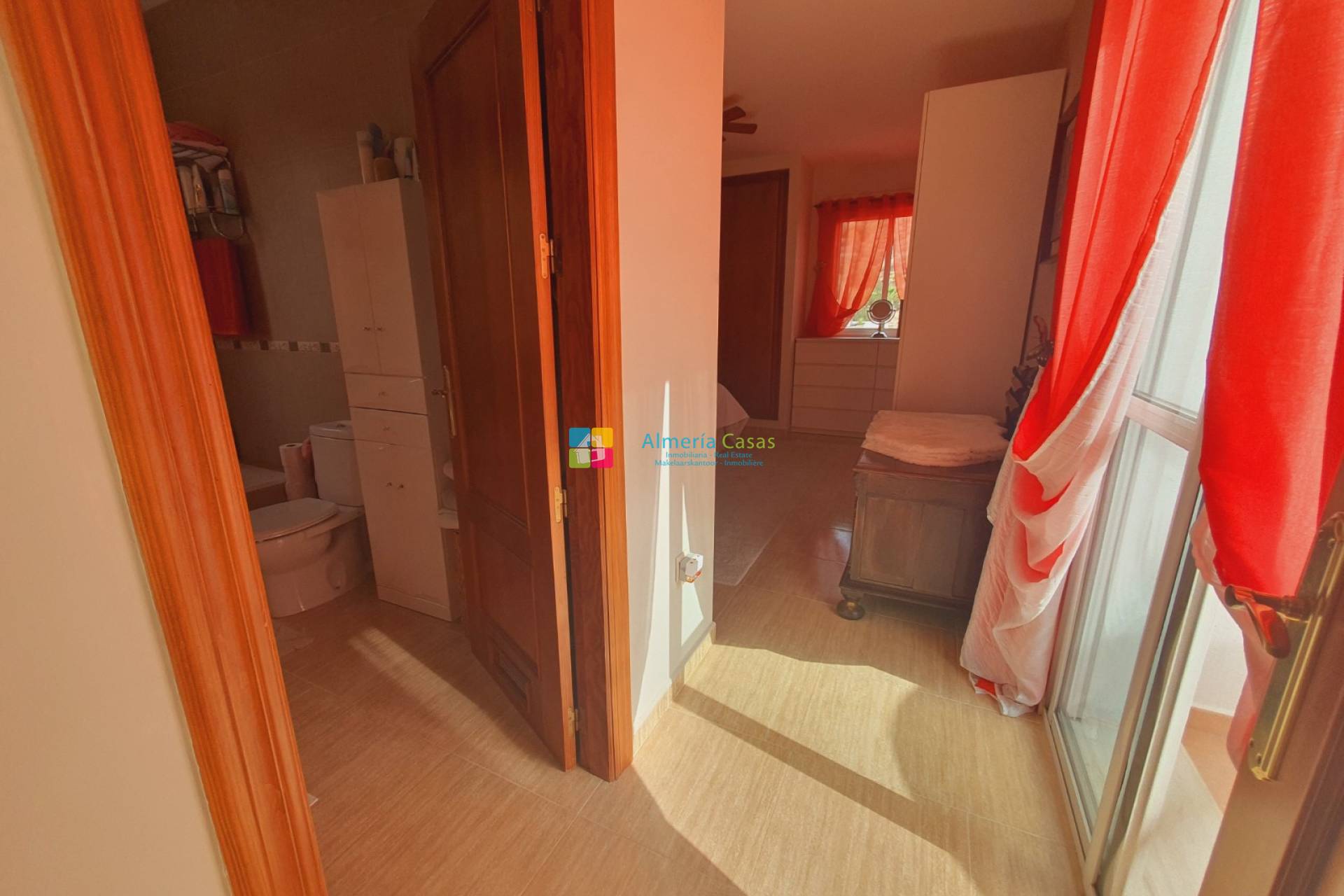 Les escaliers mènent à un palier avec accès à la terrasse sur le toit et aux deux chambres supplémentaires. Sur le côté gauche se trouve la spacieuse suite parentale avec placards intégrés, ventilateur de plafond, climatiseur et salle de bain attenante. Les portes mènent de cette chambre à la terrasse avec une vue imprenable sur les montagnes. La deuxième chambre est une chambre double lumineuse et aérée avec ventilateur de plafond, climatisation et portes-fenêtres donnant sur la terrasse.
