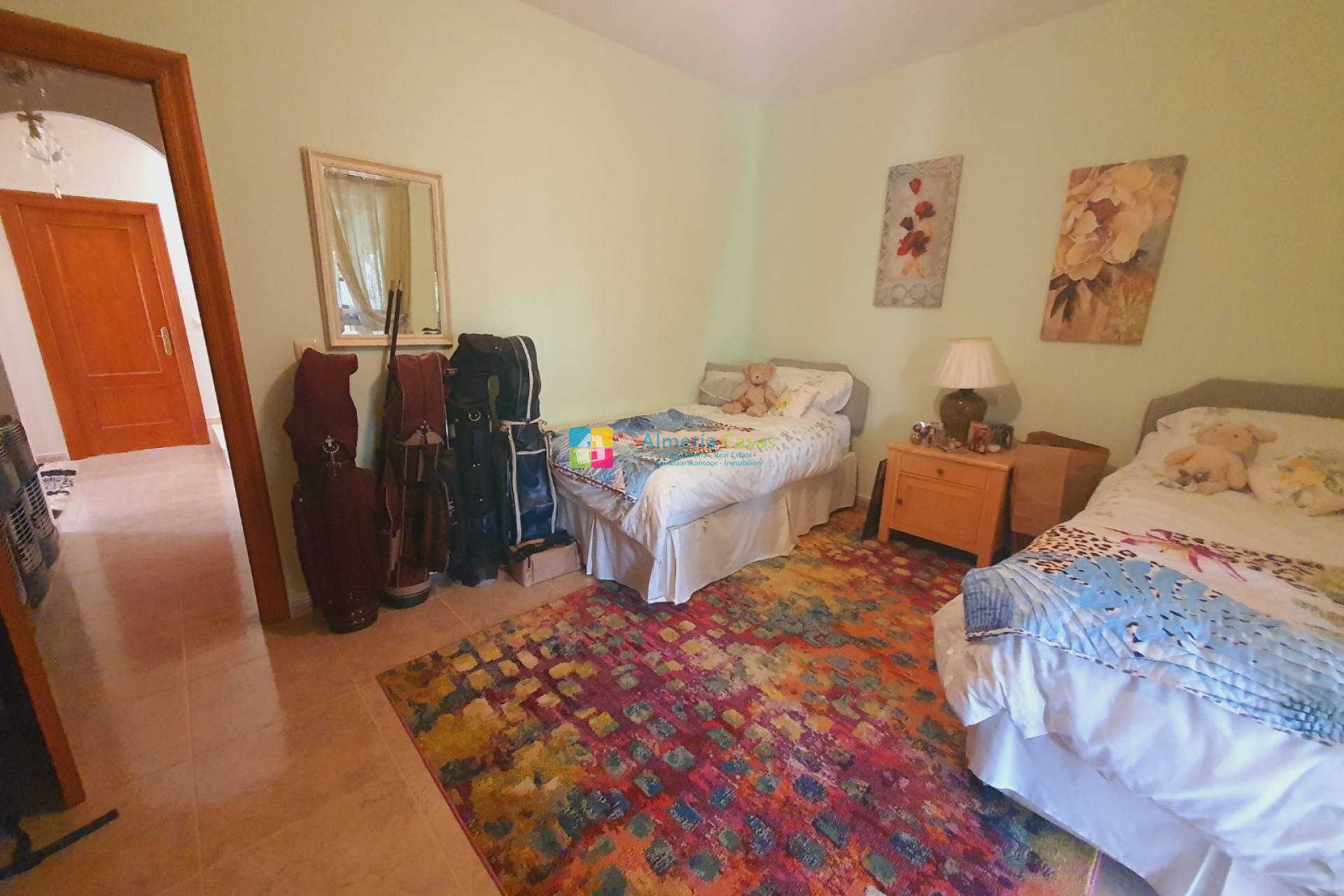 Le deuxième couloir plus petit donne accès à une grande chambre à deux lits, avec ventilateur de plafond, climatiseur et portes-fenêtres donnant sur la deuxième cuisine. À côté de cette chambre se trouve une salle de bain pour invités. De l'autre côté du couloir se trouve une grande chambre avec salle de douche attenante, deux ensembles de portes-fenêtres ouvrant sur la véranda, cette pièce bénéficie d'un ventilateur de plafond et d'un climatiseur.