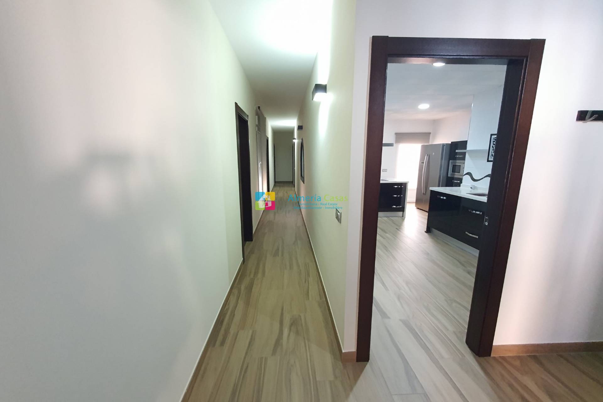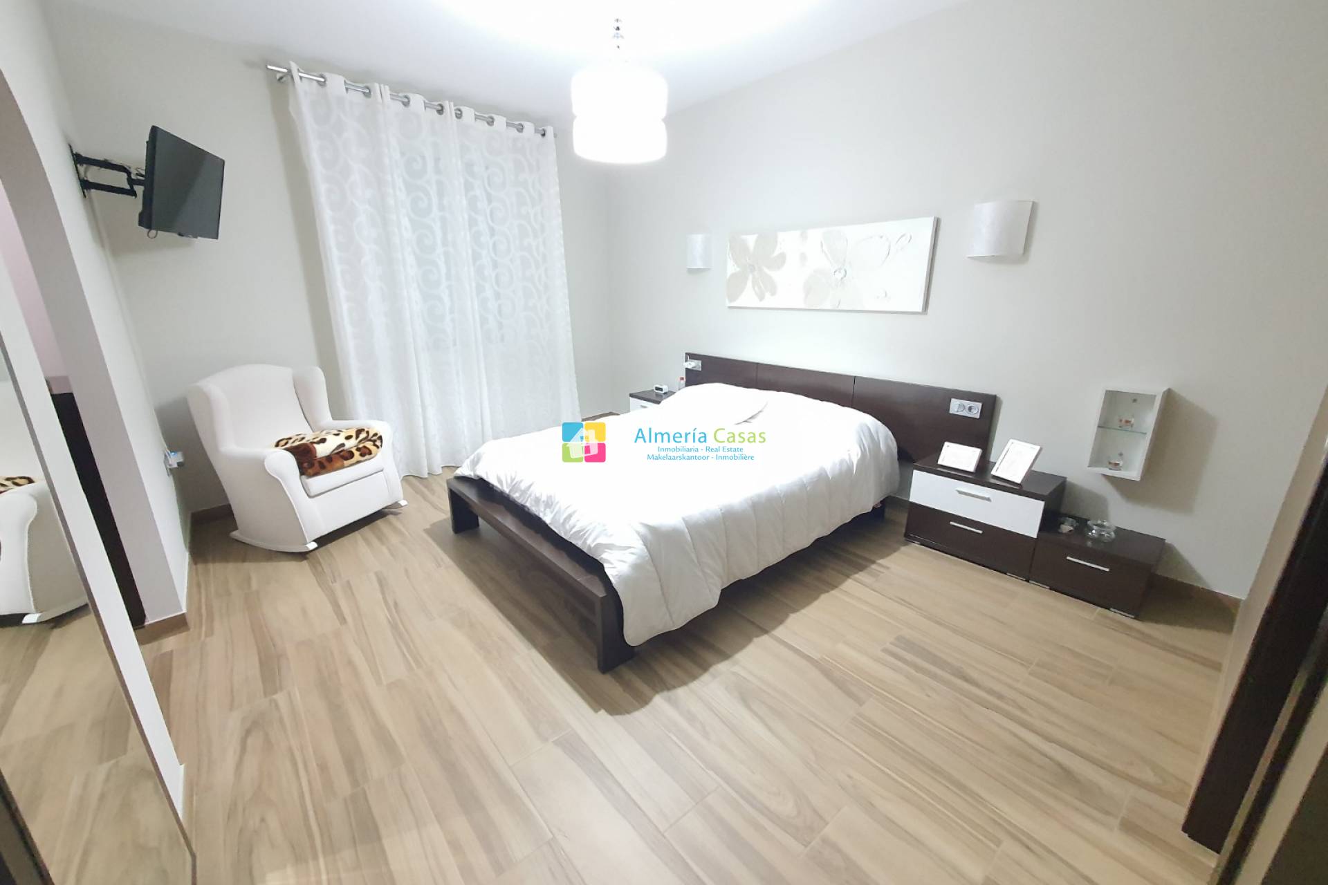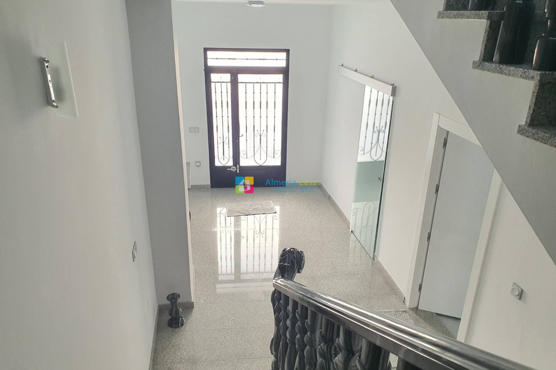 De woning heeft 2 ingangen via 2 verschillende straten. De ene ingang is via een deur naar de ondergrondse garage waar er ruimte is voor meerdere auto´s en er is een toilet, openhaard en keuken. De garage kan omgezet worden tot meer leefruimte of een er zou een winkel / zaak geopend kunnen worden. De andere straat geeft toegang naar de garage via de electrische garagedeur en de voordeur leidt naar de grote hal. In de hal is er aan de linkerkant een kamer wat gebruikt wordt als kantoor. De geweldige marmeren trap leidt naar de eerste verdieping waar er de leefruimte is. Een deur vanuit de overloop leidt naar de inkom van de woning met aan de rechterkant de zeer moderne, volledige ingerichte keuken met Silestone werkblad, een kookeiland, een berging en een terrasdeur die leidt naar een patio met een aparte wasruimte. Vanuit de inkom leiden openslaande deuren naar de grote woonkamer met airconditioning en terrasdeuren die leiden naar een groot balkon met uitzichten over het dorp. Vanuit de inkom leidt een lange gang naar de slaapkamers. Aan de linkerkant zijn er 3 tweepersoonsslaapkamers, waarvan 1 met toegang tot een patio. Aan de rechterkant is er de zeer moderne badkamer met douche en aan het einde van de hal is er de zeer ruime masterbedroom met airconditioning, grote kleedkamer en een badkamer en suite.
