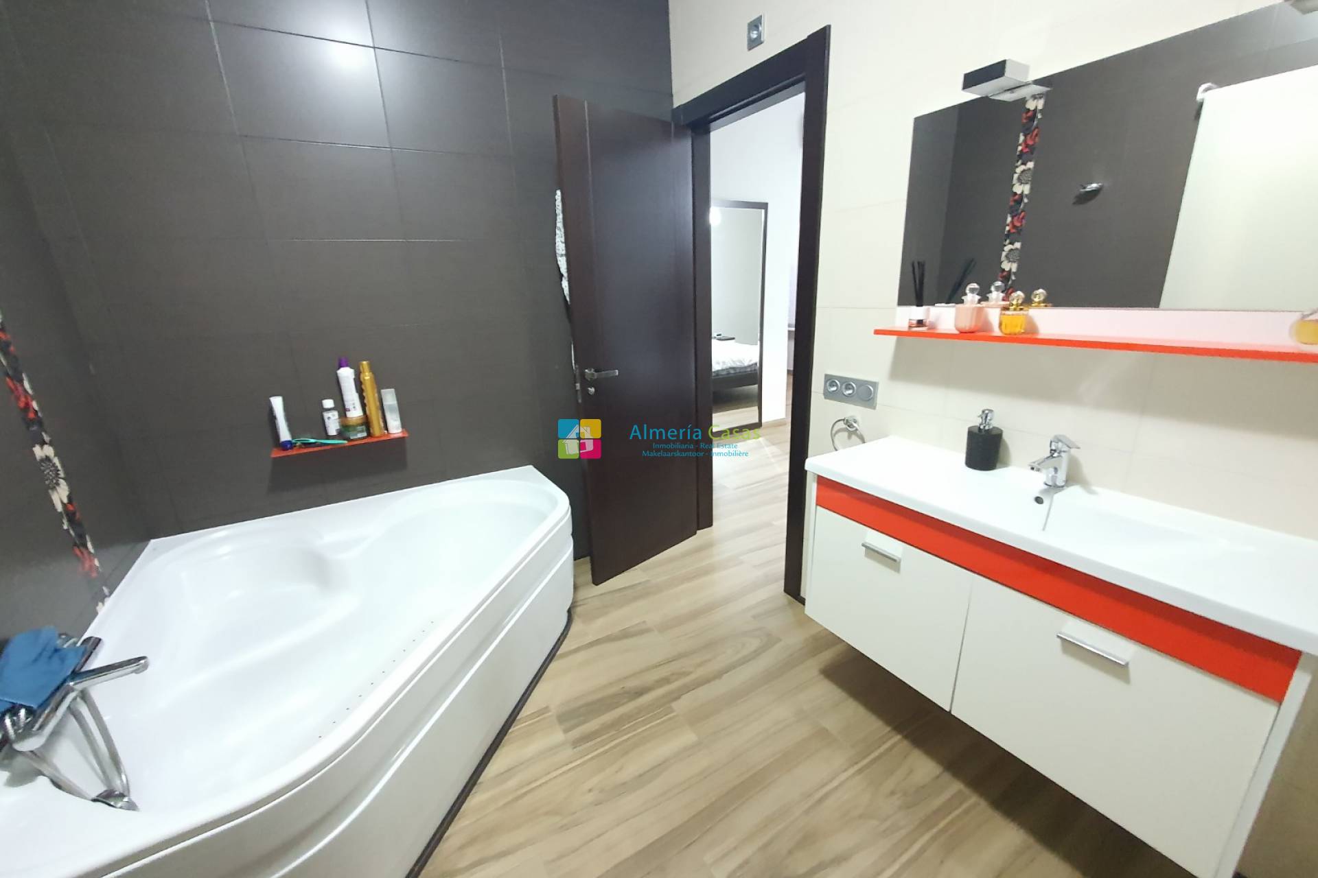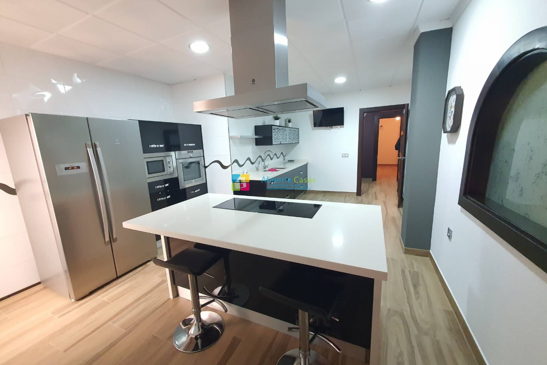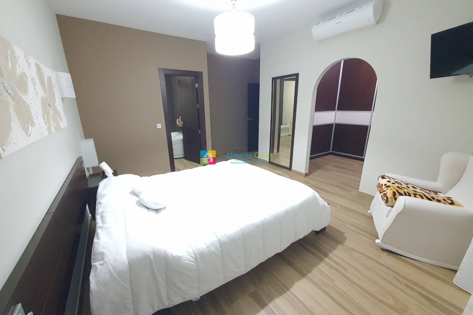 De woning heeft 2 ingangen via 2 verschillende straten. De ene ingang is via een deur naar de ondergrondse garage waar er ruimte is voor meerdere auto´s en er is een toilet, openhaard en keuken. De garage kan omgezet worden tot meer leefruimte of een er zou een winkel / zaak geopend kunnen worden. De andere straat geeft toegang naar de garage via de electrische garagedeur en de voordeur leidt naar de grote hal. In de hal is er aan de linkerkant een kamer wat gebruikt wordt als kantoor. De geweldige marmeren trap leidt naar de eerste verdieping waar er de leefruimte is. Een deur vanuit de overloop leidt naar de inkom van de woning met aan de rechterkant de zeer moderne, volledige ingerichte keuken met Silestone werkblad, een kookeiland, een berging en een terrasdeur die leidt naar een patio met een aparte wasruimte. Vanuit de inkom leiden openslaande deuren naar de grote woonkamer met airconditioning en terrasdeuren die leiden naar een groot balkon met uitzichten over het dorp. Vanuit de inkom leidt een lange gang naar de slaapkamers. Aan de linkerkant zijn er 3 tweepersoonsslaapkamers, waarvan 1 met toegang tot een patio. Aan de rechterkant is er de zeer moderne badkamer met douche en aan het einde van de hal is er de zeer ruime masterbedroom met airconditioning, grote kleedkamer en een badkamer en suite.