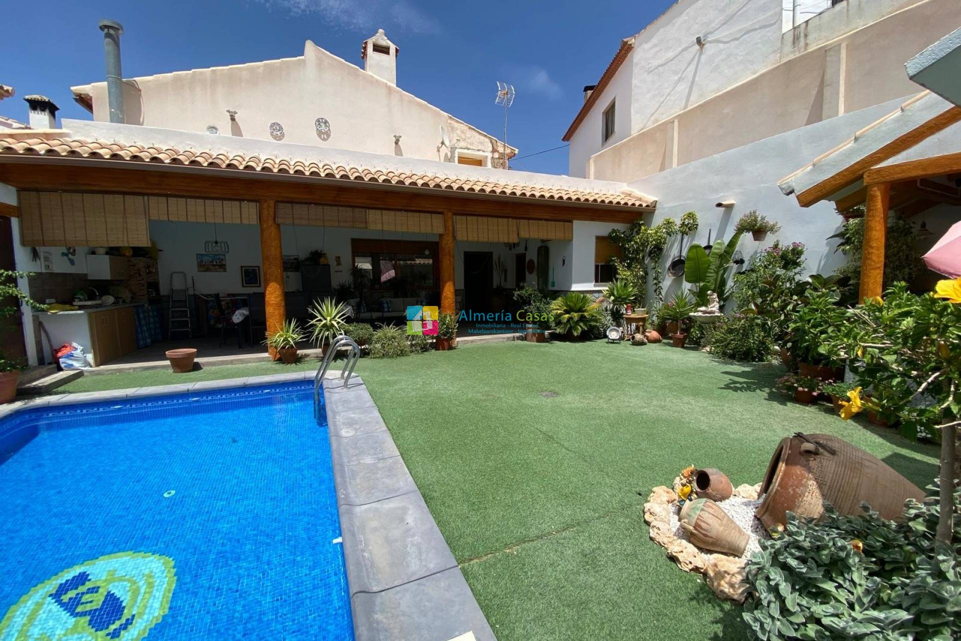 Terug in de hal op begane grond is er aan de rechterkant een tweepersoonsslaapkamer met airconditioning. Vanuit de hal is er toegang tot de woonkamer met aan de linkerkant de ruime, compleet ingerichte keuken. De woonkamer met airconditioning is zeer licht en ruim met een groot raam voorzien van electrische rolluiken met uitzicht op de tuin / zwembad. Vanuit de woonkamer is er een moderne badkamer met douche. Een terrasdeur vanuit de woonkamer leidt naar een groot overdekt terras met aan de linkerkant een badkamer met douche wat tevens een wasruimte is. Het terras heeft een keukenblok met een bbq een heerlijke plek om te eten en te relaxen. De tuin is mooi aangelegd met een oase aan bloemen, struiken en planten. Rondom het verwarmd zwembad is er kuntgras aangelegd en er is genoeg ruimte om te zonnebaden. In de hoek van de tuin is er een gezellige bar ingericht, Vanuit de straat is er ook direct toegang tot de tuin.