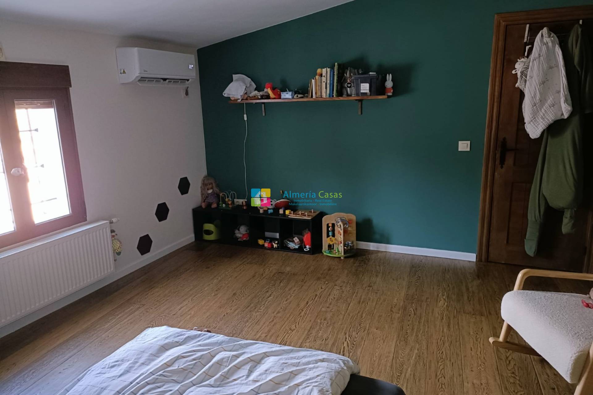 The back door leads into a hallway where there is a handy pantry / storage cupboard. To the left of the hallway there is access to the kitchen. Straight ahead in the hallway there is a toilet on the right and next to it a laundry / storage room. From the hallway there is access to the large living room and separate dining room with a wood burner and at the end there is the very luxurious, fully equipped kitchen with all amenities with an island with breakfast bar. The living and dining room is a very large and cozy space. To the right of the living room there is a separate TV room with wood burner. At the end of the living room there is a sitting room with wood burner with next to it access to another (bed)room with a door that accesses the rear of the house. The entire ground floor has underfloor heating. In the hallway the stairs lead to the first floor with wooden floors. To the right of the hallway there is a beautiful bathroom with bath and shower. To the right there is the master bedroom with air conditioning, separate dressing room, and bathroom with shower en suite. There is another double bedroom with air conditioning with access from the hallway. In the hall there is a handy linen cupboard with next to it a living room with a storage cupboard. Next to this living room there is a bedroom and a bathroom with shower en suite, a bedroom with air conditioning and next to that another bedroom with air conditioning. The entire upper floor is equipped with radiators via the central heating.