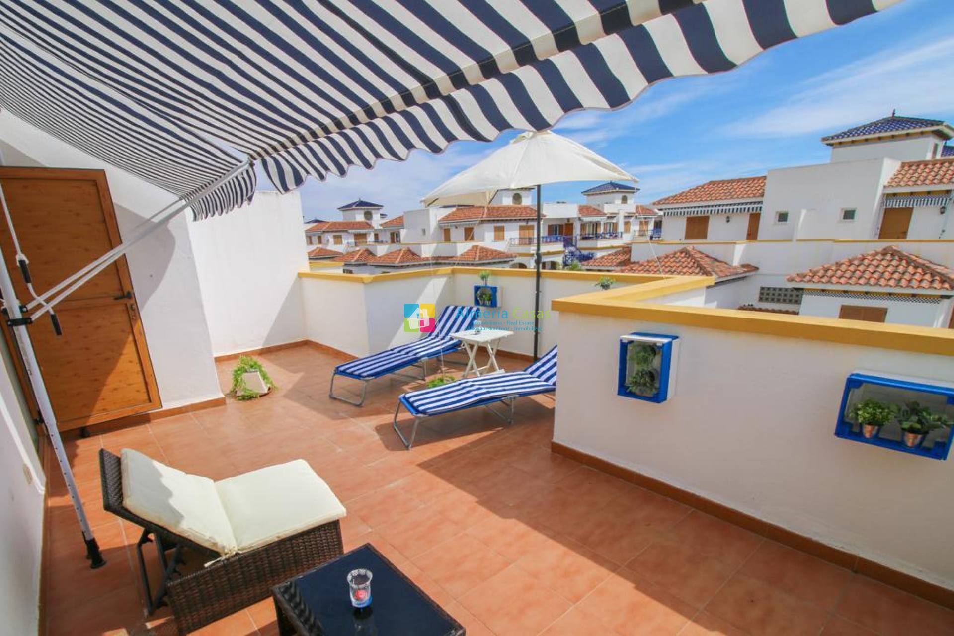 It is penthouse. It has air conditioner and sea views and it has aluminum windows, built-in wardrobes, communal swimming pool, double glazing, terrace and open kitchen.
