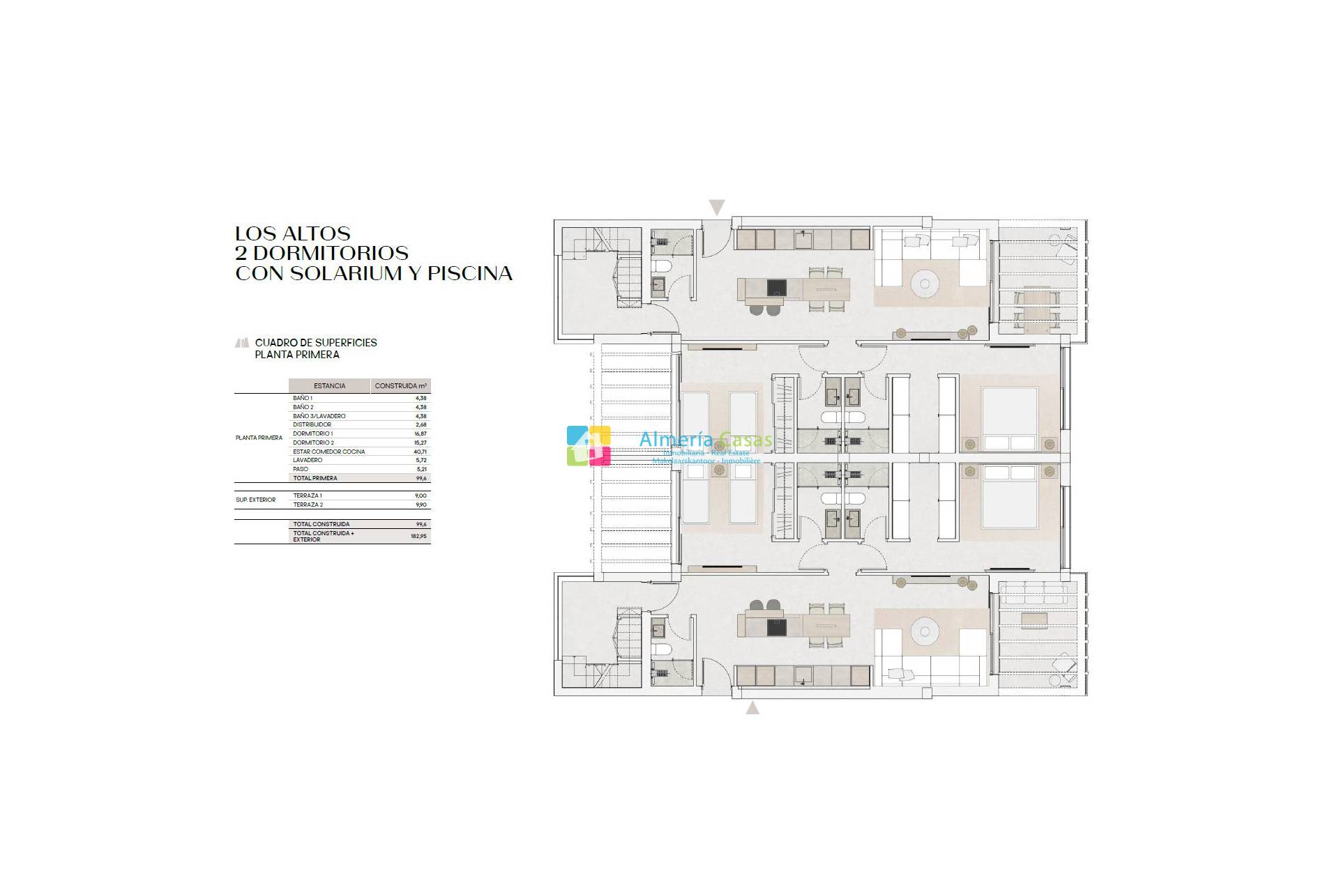These quality apartments “Los Altos” are nestled in the Macenas resort. A new residential destination that offers a luxury yet simple and authentic lifestyle. Its privileged location between Sierra Cabrera and the Mediterranean Sea, residents enjoy its climate all year round, with 22ºC medium temperature. There are breathtaking views and a serene environment. The resort boasts of many amenities including restaurants, sports and health center, beauty and aesthetic center, swimming pool and lounge, nautical sports and activities, social club, food store, golf club, medical clinic, local craft store. The beautiful beaches are just a stroll away.